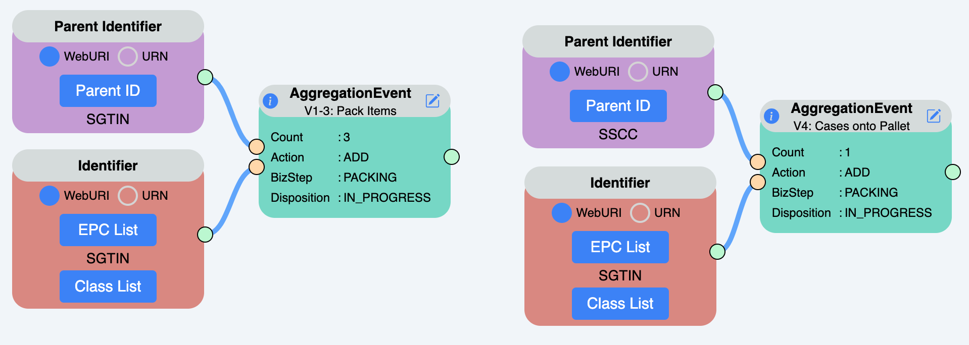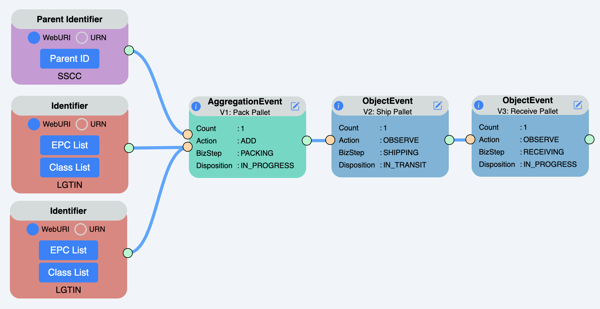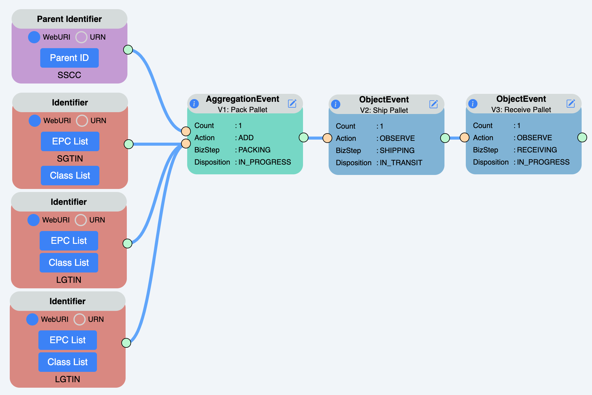 - Pack cases into pallet (Identified as parent SSCC of palletn,Children: SGTINs of cases)